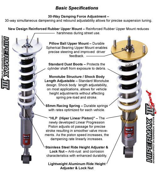 Series Concept: Designed and tuned for competition / track.The Hipermax III Sport series has firmer spring rates and valving to take advantage of the smoother, more consistent pavement of race tracks allowing quicker, more precise transient response and instant direction changes necessary in competition. In addition, the Hipermax III Sport incorporates HKS’ all-new Hiper Linear Piston fluid-channel system, shock-body length adjustability (most applications) and ultra-thick chrome plating of the cylinder shaft for excellent durability and reduced stiction (static friction). Spherical bearings, for precise steering and feedback, are standard – but reinforced, rubber upper mounts are available for those seeking reduced vibration from less-than-smooth pavement.
