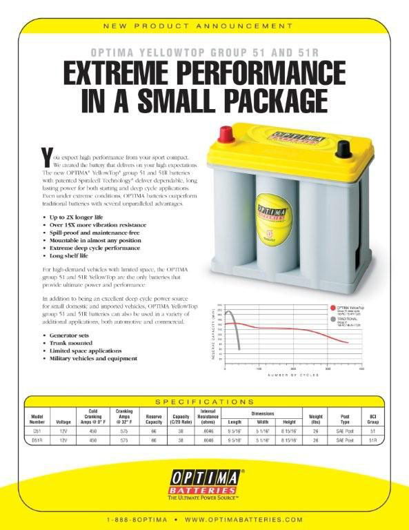 Have you always been a fan of the Optima battery line but bummed that you couldn’t get one to fit your Honda or Nissan 240 SX. Well those days are over. Optima now offers a smaller battery to fit smaller vehicles especially sport compact performance rides.