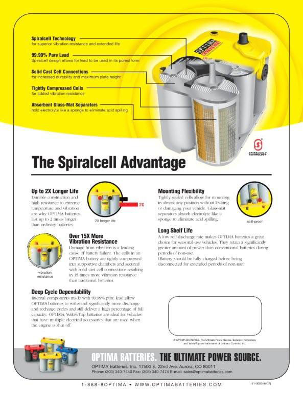 OPTIMA is like no other battery in the world. The unique SpiralCell design offers the most advanced technology and provides a strong and clean power source that far surpasses any of today’s filled lead-acid batteries. With OPTIMA under your hood, you can count on a longer lasting battery life under starting and deep-cycle applications.