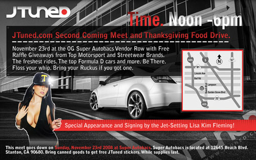 Fan favorite website JTuned is coming back and in a big way. To celebrate their re-launch they’ll be having a large meet/thanksgiving food drive at Super Autobacs in Stanton CA. We will be there with the MotorworldHype IS-F GT. So come on by check out the cool cars and say hi to RJ de Vera or Myself. If you bring canned goods you’ll get some free Jtuned stickers too!