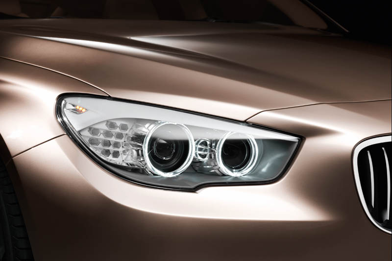 The dual round headlights typical of a BMW come with new contour lines and a new technology for the daytime running lights on the BMW Concept 5 Series Gran Turismo. Slanted to a distinctive angle and extending far into the fenders, the headlight units are highlighted by surrounding bars, the headlights themselves cylindrical in shape bordering at the top on a matte headlight cover. This emphasizes the unique look of the front end, with its clear, penetrating focus. Apart from the turn signals, the new LED corona rings for the daytime running lights generate bright, even light.Side-view: coupe-like roofline and waistline emphasizing the sleek elegance of the car.