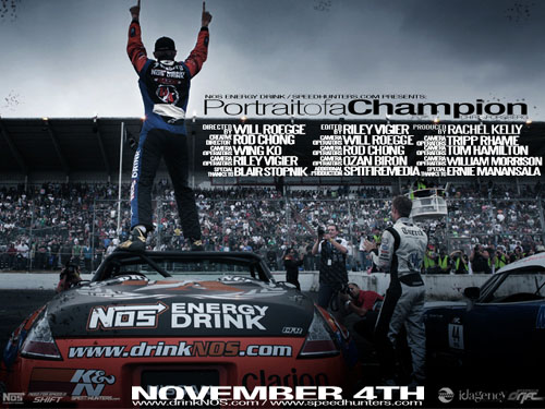 I didn’t see the press release on this until wayyy too late, and it cost me a NOS cooler! Oh well, you guys need to know about this anyway. NOS Energy Drink, Automotive Film Master Will Roegge, and Speedhunters.com all collab’d together to create a short film documenting Chris Forsberg’s 2009 Championship season in Formula D. The film will make its official debut at SEMA but it will also go live on NOS Energy Drink’s website and on Speedhunters.com on November 4th.