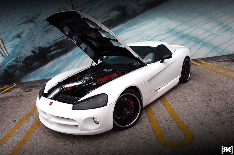 Do any of you know a vet? Because this Viper is SICK!!!! I spotted this vision of freshness on 6speedonline.com but the pics and video came courtesy of RiceKiller.com. Yeah, with a name like that I know what you’re thinking but let us put that aside for now and appreciate this awesome beast! Apparently the satin white is a vinyl wrap but its very nicely done and I get an extra kick out of the fact that the car matches the MotorworldHype color way! Word has it that with both snails blazing this V10 monster puts down over 1300HP! The real kicker is that it’s for sale and they want less than 100k for it! P.S. The video below is cool but you might want to turn down the speakers because instead of a motor symphony the audio is all emo-metal. So unless you dig that kind of thing you may want to put on some music you actually like then watch the vid.