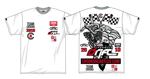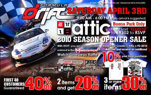 There is going to be a big sale this weekend at ATTIC In Buena Park to celebrate the 2010 season opener of Formula Drift. If you show up early you can get massive discounts on some fresh stuff! I’m talking up to 50% off everything in the store! There will also be a special limited edition Formula DriftxATTICxCrooksNCastles collab tshirt for sale. Check out the design and all the event info below.