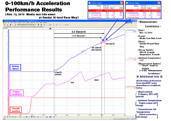 The acceleration time was measured during the media test ride event held at the Sendai Hi-land Race Way on November 12th, Friday and 13th, Saturday. On both days, the GT-R clocked in with a time of 3.0 seconds.