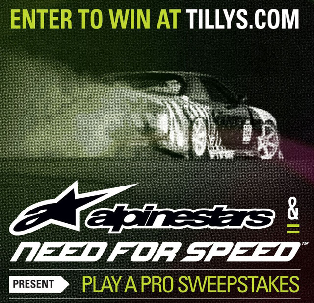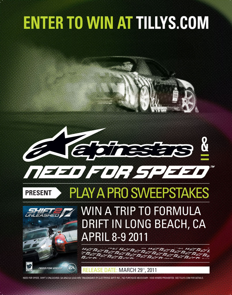 Want to go to the first round of Formula Drift but don’t have the scratch to make the trip? Well Alpinestars, Need For Speed SHIFT 2, and Tilly’s have teamed up together to help you out. If you visit a Tilly’s store or go to the official contest website you can enter to win a trip to Formula Drift Long Beach, get a ride along with team Need For Speed driver Matt Powers, gain VIP access to the Need For Speed hospitality area, and play Need For Speed SHIFT 2 before anyone else with Vaughn Gittin Jr.! If you think fate is on your side then you definitely need to enter this contest ASAP. If you don’t win then…well ok there is little consolation but hey there is always the driftstream and gamefly!