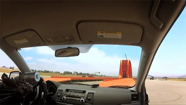 The engineers stripped down what looks to be a Mitsubishi Lancer wagon and equipped it with the same suspension set up and settings as the stunt cars that would be driven by Tanner and Greg.  Then they rigged up the car to be driven remotely and handed said remote to a highly experienced military drone pilot whose identity is classified.  Serious stuff!  So how did the test go?  See for yourself below.