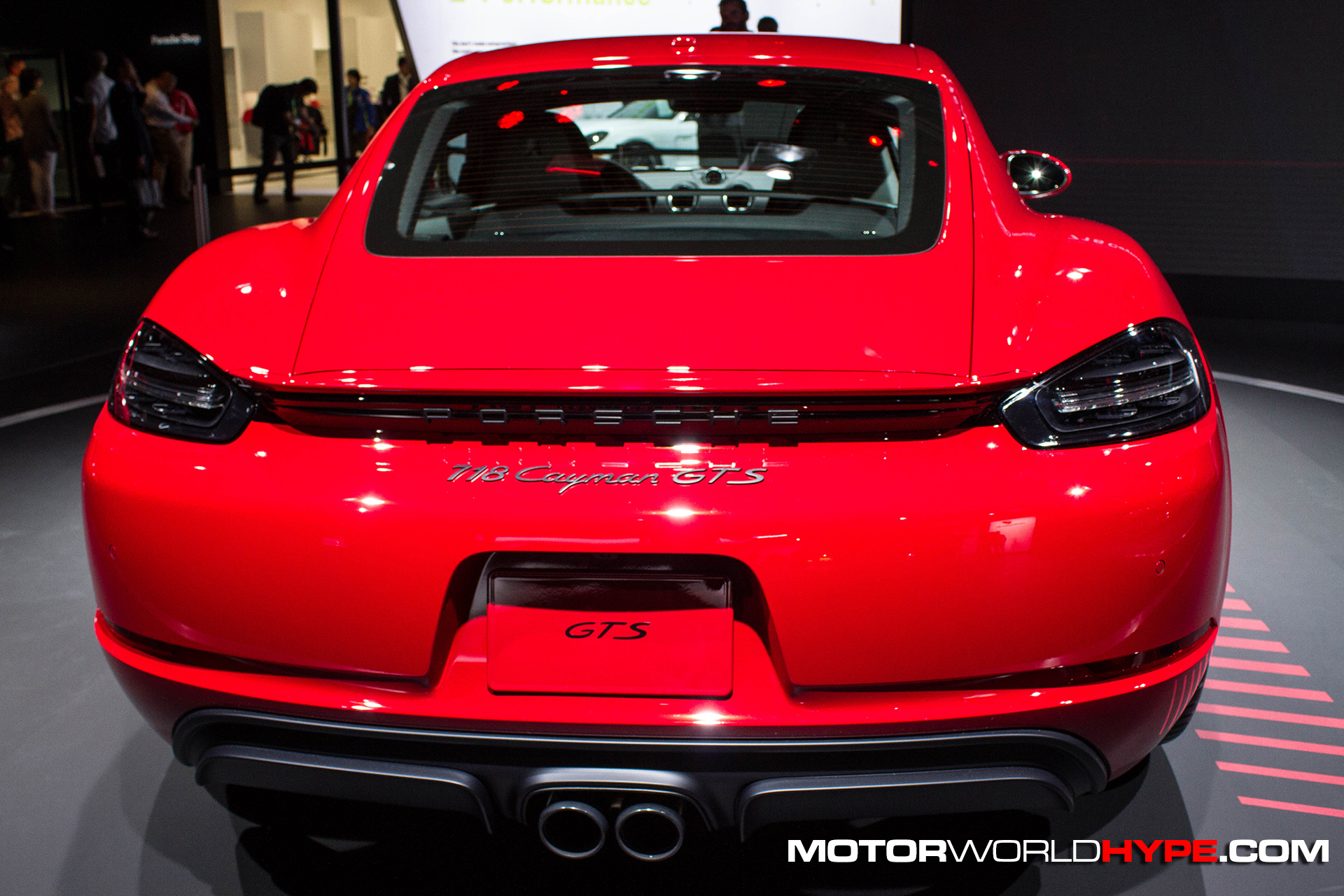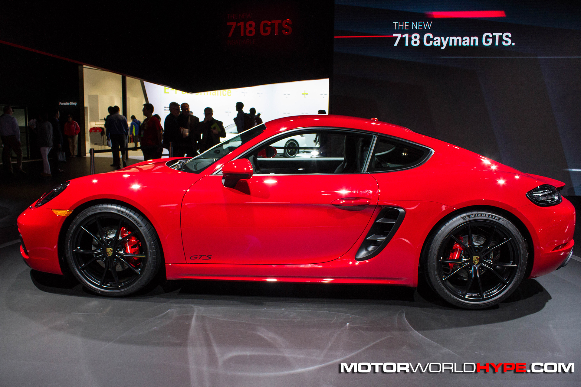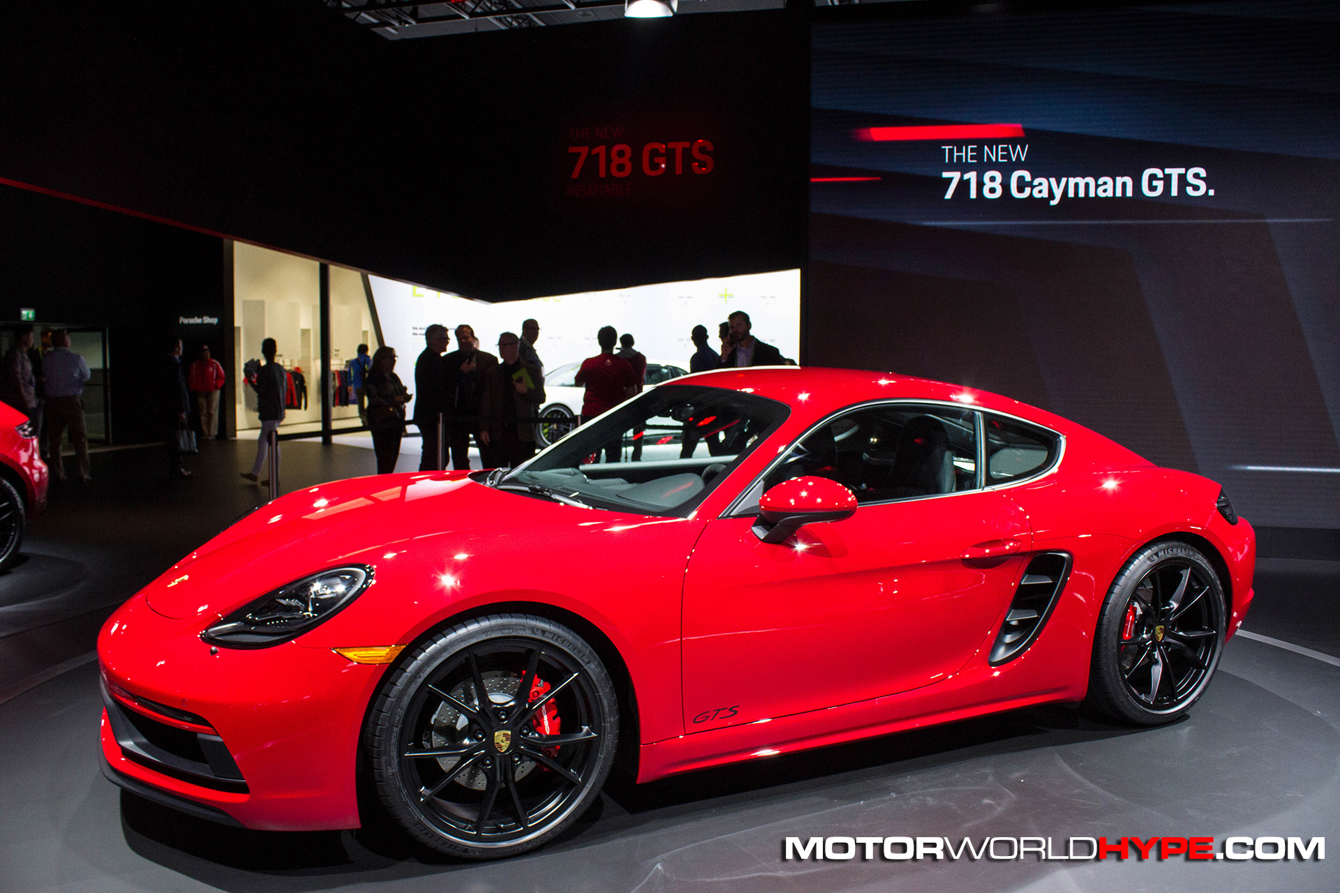 Yes, Porsche does in fact listen to their fans.  The first car revealed at the swanky Porsche exhibit is the 718 Cayman GTS.  As you may have guessed, the GTS picks up where the 718 S leaves off, adding more power and torque with the help of a turbocharger.