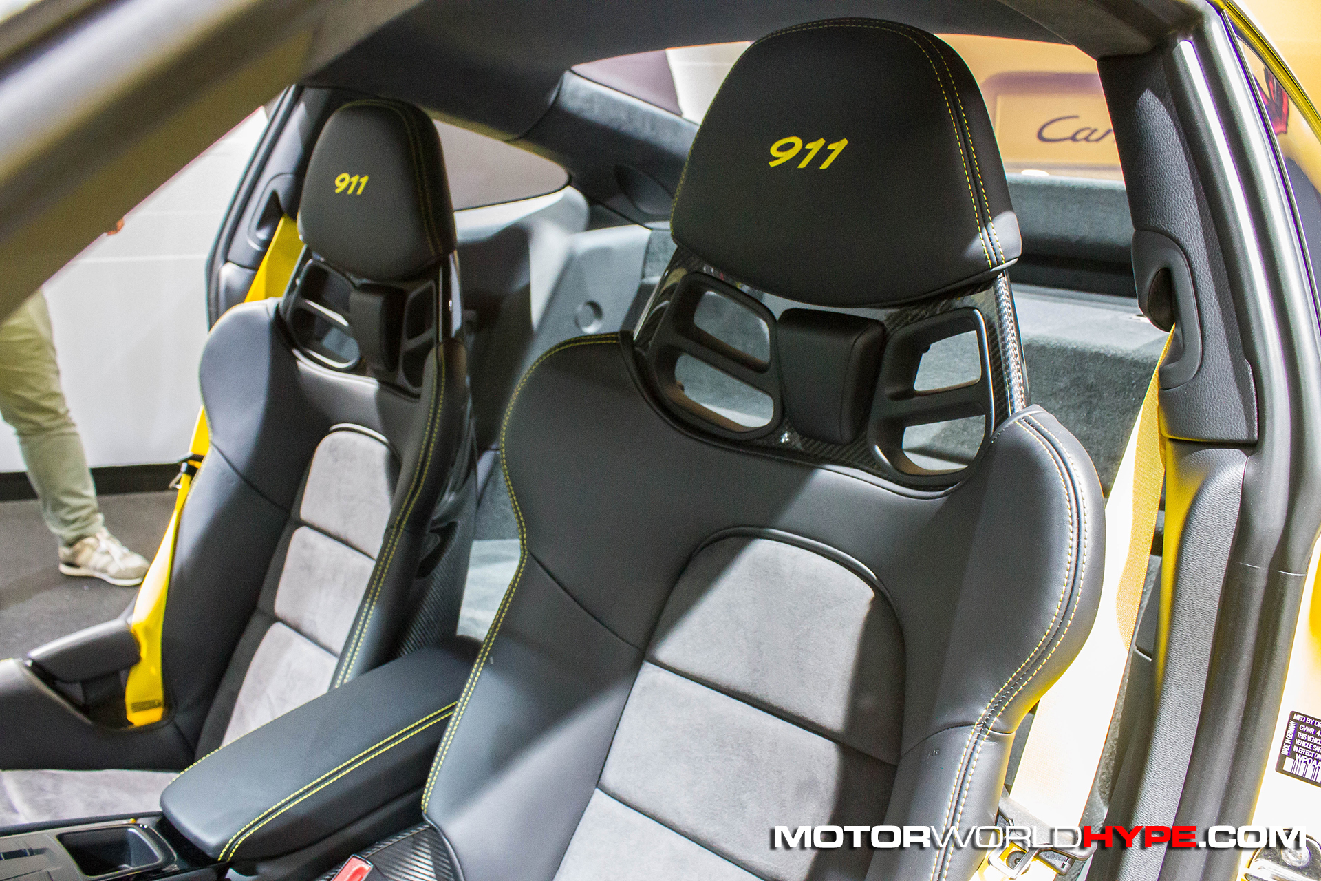 Like the 718 GTS, the 911 has blacked out logos, an exclusive wheel design, and a very subtle front lip spoiler.  Inside, things are a little more flashy with stitched logos in the seats and even the option of color matched seatbelts.