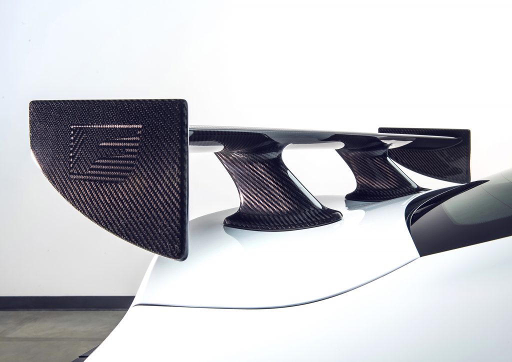 To accomplish that paradoxical feat, the engineers started by shaping the wing in a way that smooths the airflow over the rear of the car to decrease drag-inducing turbulence. They then added a very slight angle of attack to produce downforce without compromising the overall airflow. The result is up to 58 pounds of additional downforce compared to the active rear spoiler.