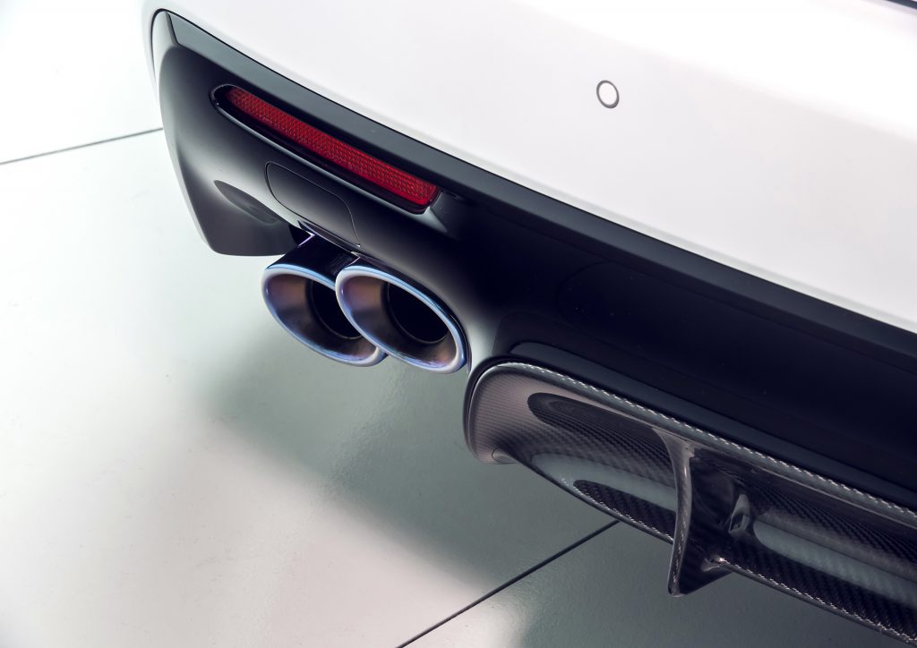 To keep it planted, the Track Edition comes with several aero enhancements and most of them are made from carbon fiber. Additionally a carbon fiber roof and titanium muffler (and tailpipes) are both major sources of the aforementioned weight reduction.