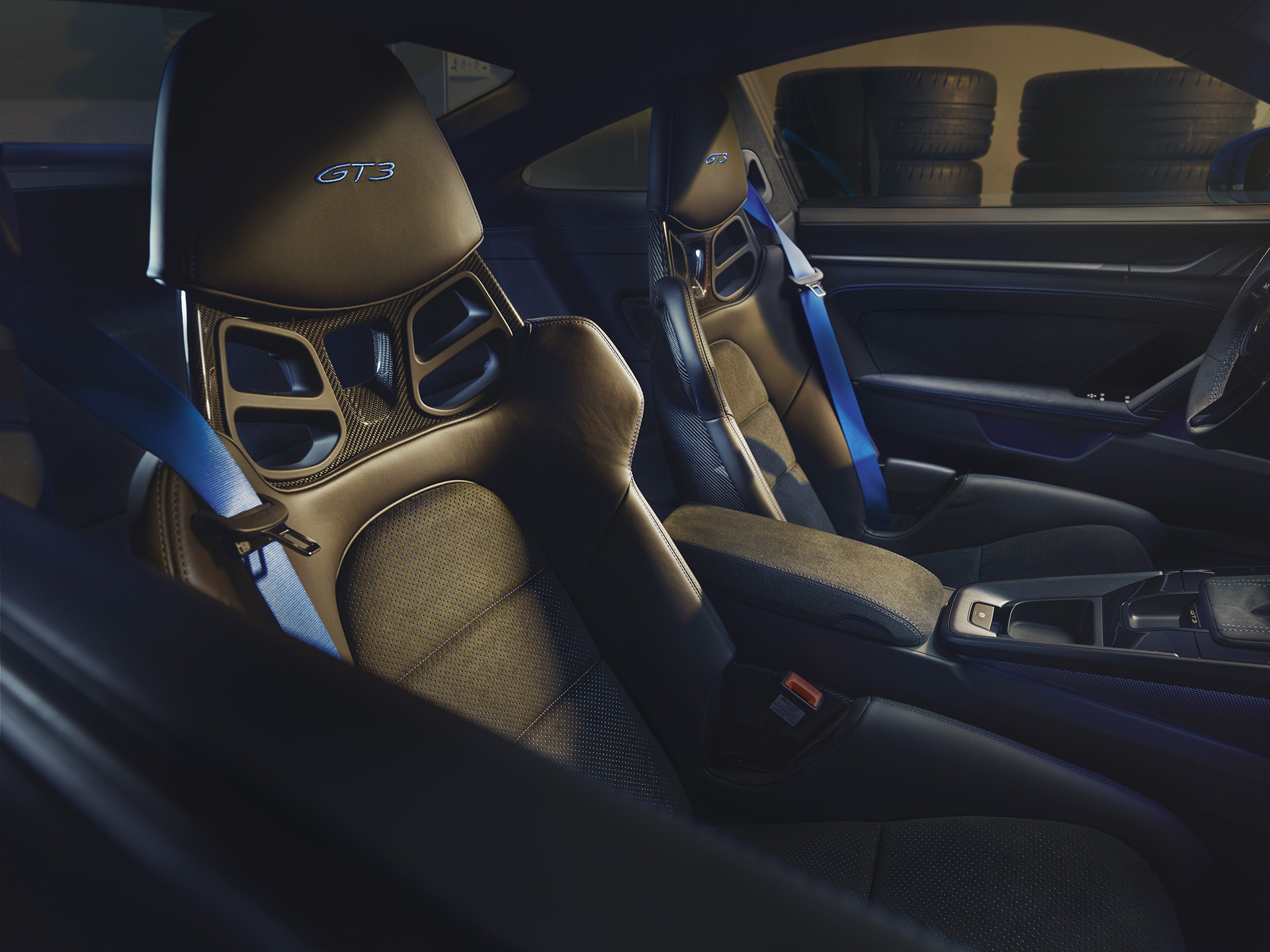 Covering up the brakes are a set of forged wheels exclusive to the GT3. The wheels are staggered with 20 x 9.5″ rollers up front and 21 x 12″ wheels in the back. Standard rubber comes by way of 255/35ZR 20 tires up front and 315/30 ZR 21 tires in the rear. The standard tires are made with a “ultra high-performance summer” compound. However, Porsche will make their special “street legal race tires” available for the first time on a GT3. Previously those tires were only available for GT3 RS models.