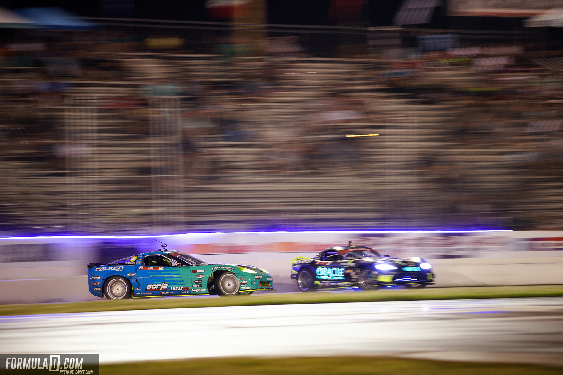 Kearney continued his wet weather giant-slaying campaign by eliminating 2011 Formula Drift champion Dai Yoshihara from competition.