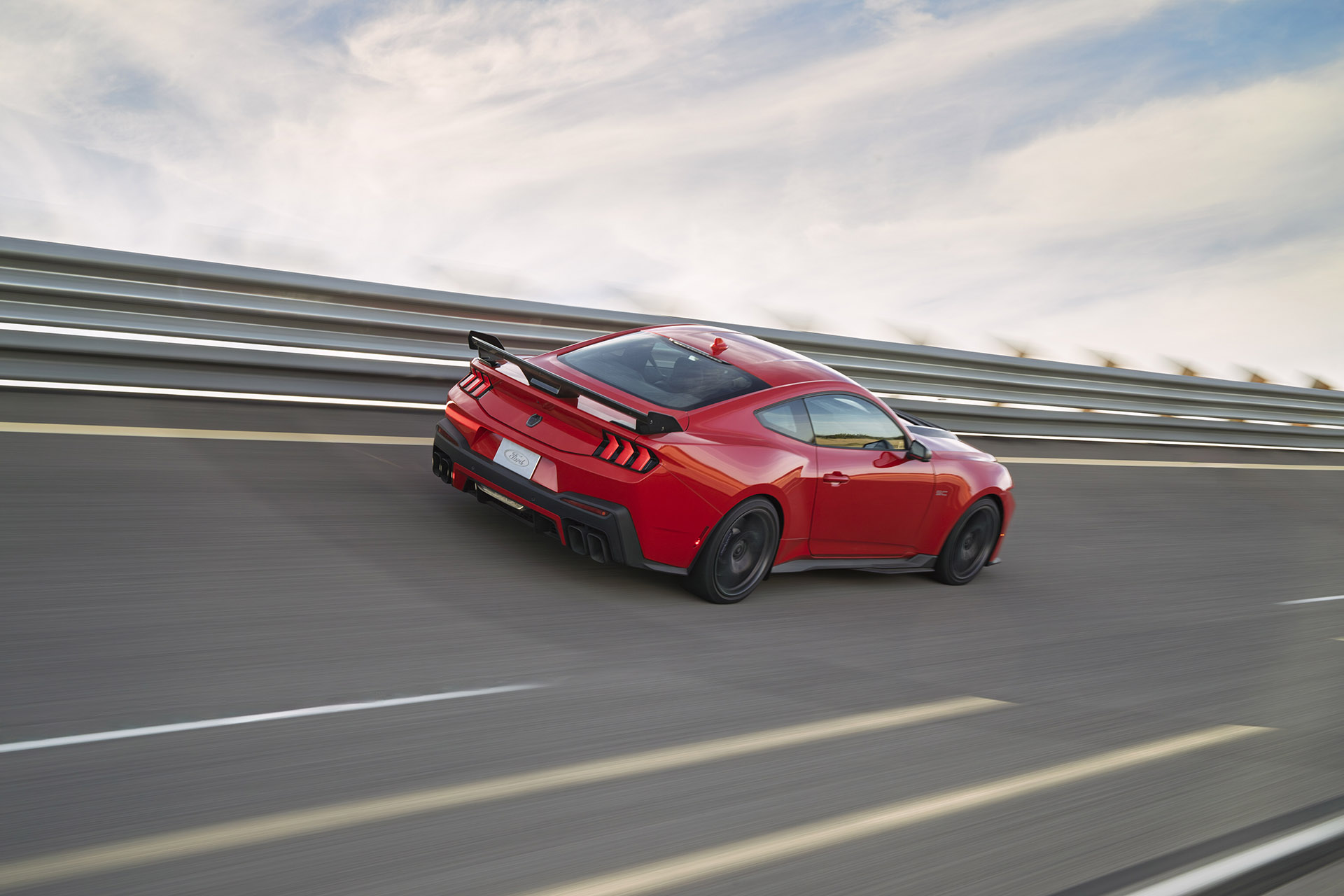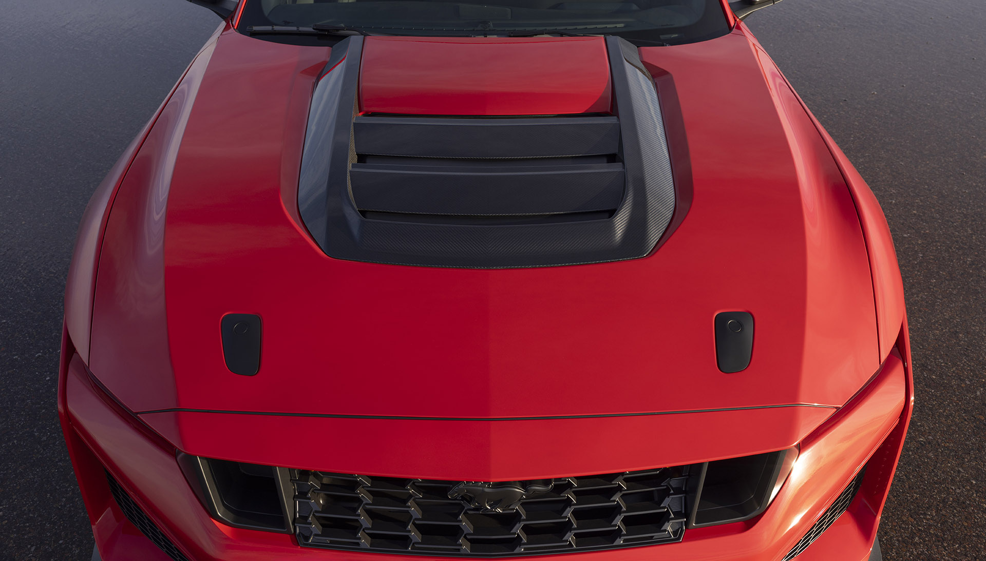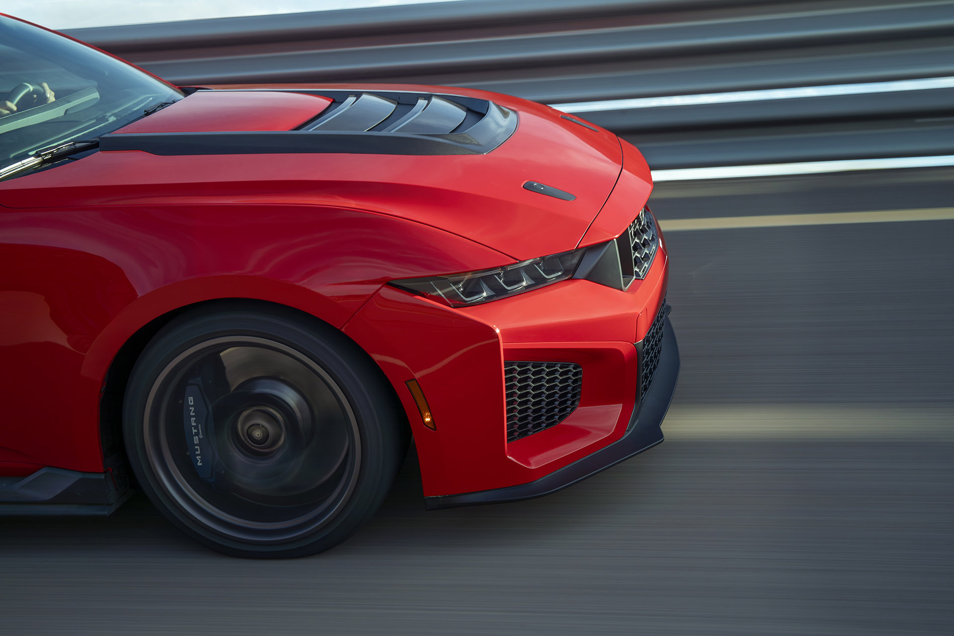 Though first, let’s talk about what sets the Dark Horse SC apart from the other models. For starters, the Dark Horse SC is wearing a new aero package that includes a new hood, carbon fiber venting, and a revised front fascia with a massive front air dam. Not only does the package give the Dark Horse SC a menacing new look, it also boosts aerodynamic performance over the Dark Horse Performance Package. In fact, Ford claims that the optional ducktail decklid spoiler that comes with the Dark Horse SC’s Track Pack increased efficiency by 10 percent without compromising weight or visibility.