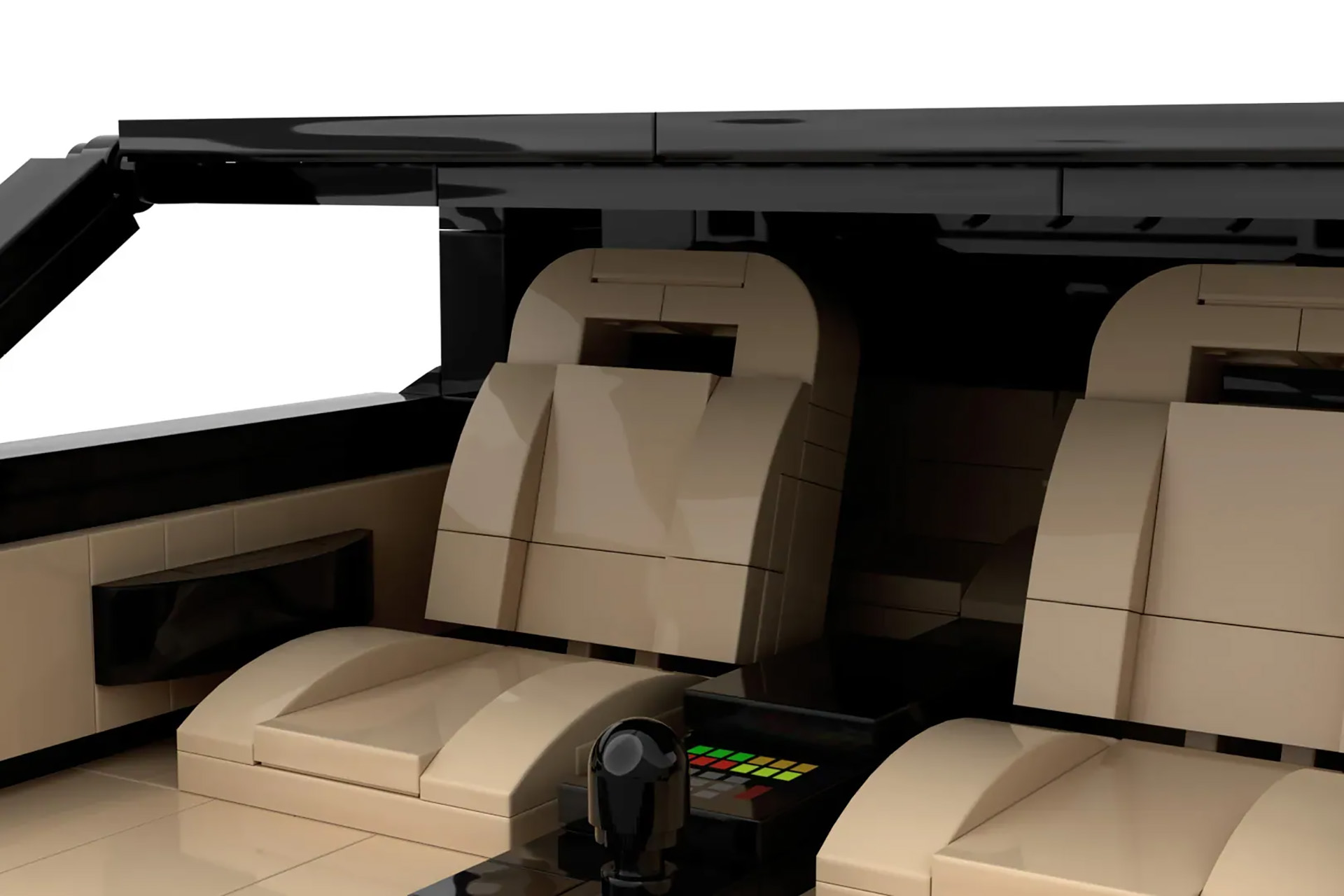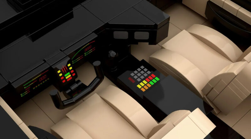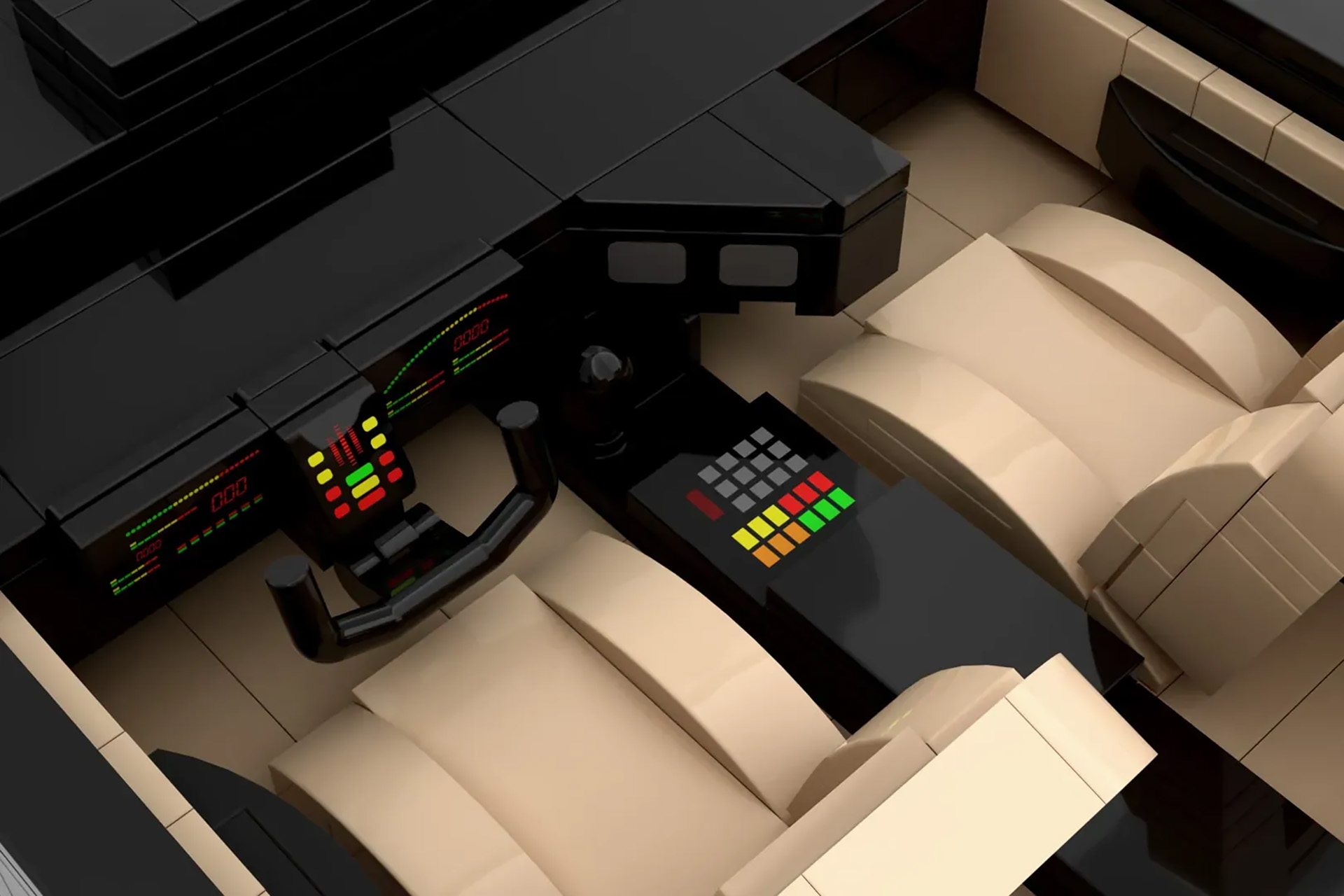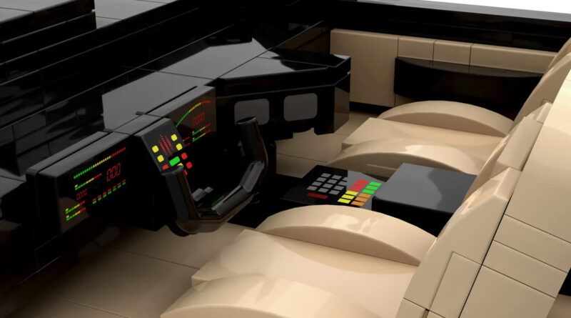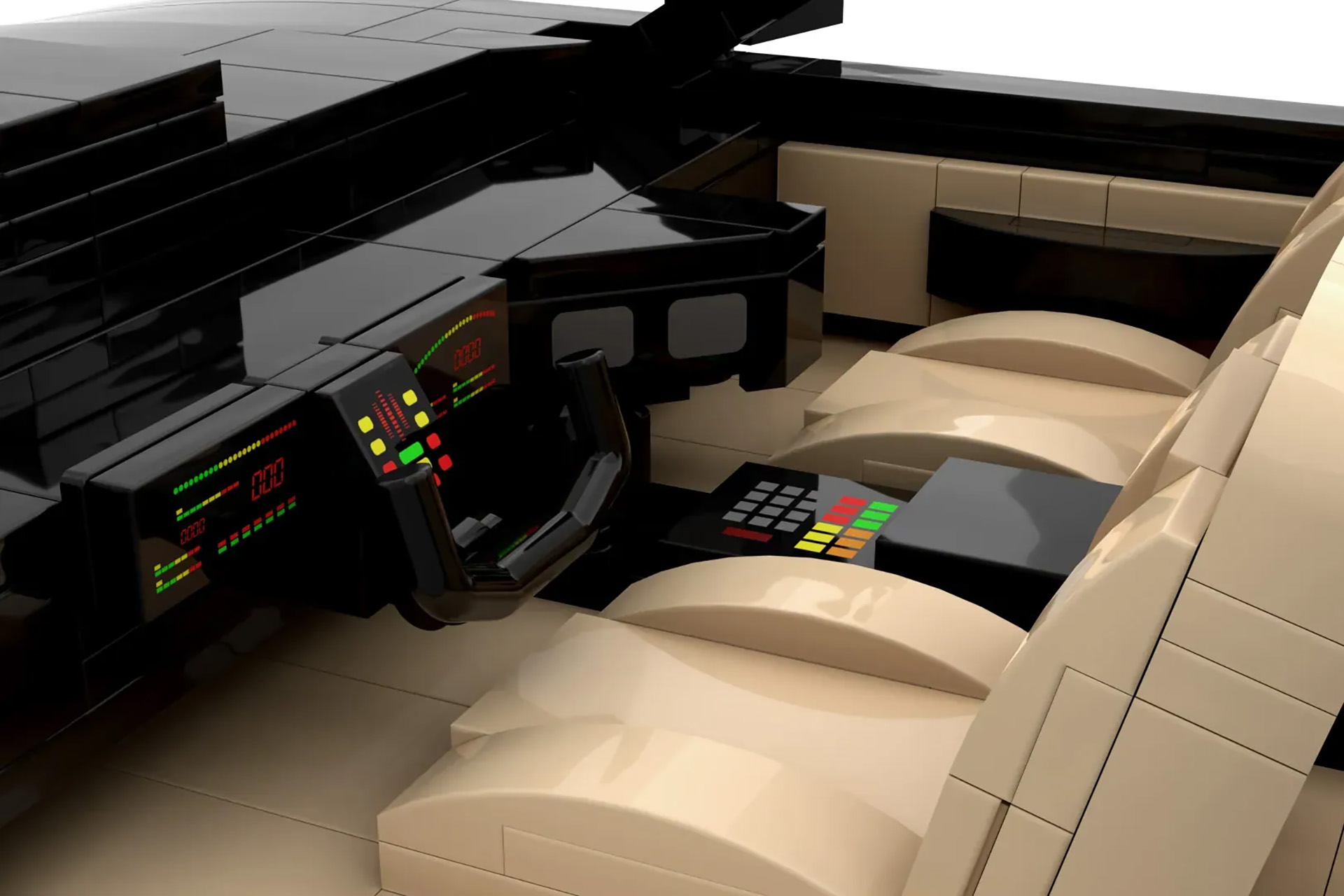 Despite being made of plastic bricks, this set does justice to K.I.T.T.’s lines and shape. Naturally, it includes the iconic “scanner” rendered here in translucent red Lego pieces. The original disc-style wheels come through as well. Though the most impressive details are inside the model. The custom dashboard created for the show is completely represented here, down to the yoke steering wheel and positioning of all the buttons, screens, and the vertical lightbars that animated when K.I.T.T. would speak. We also can’t forget that ’80s-tastic tan upholstery.